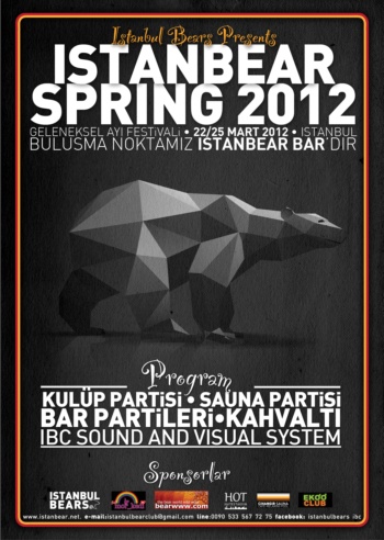 ISTANBEAR İLKBAHAR FESTİVALİ 2012 ( 22-25 Mart, ISTANBUL ) 6 yıldır senede 2 defa yapılan, istanbul ayıları grubu trafından düzenlenen istanbear ayı festivalinin ilkbahar partisi olan ISTANBEAR İLKBAHAR FESTİVALİ 22-23-24-25 MART 2012 tarihlerinde istanbul`da yapılacak. Dünyanın ve Türkiyenin her t...